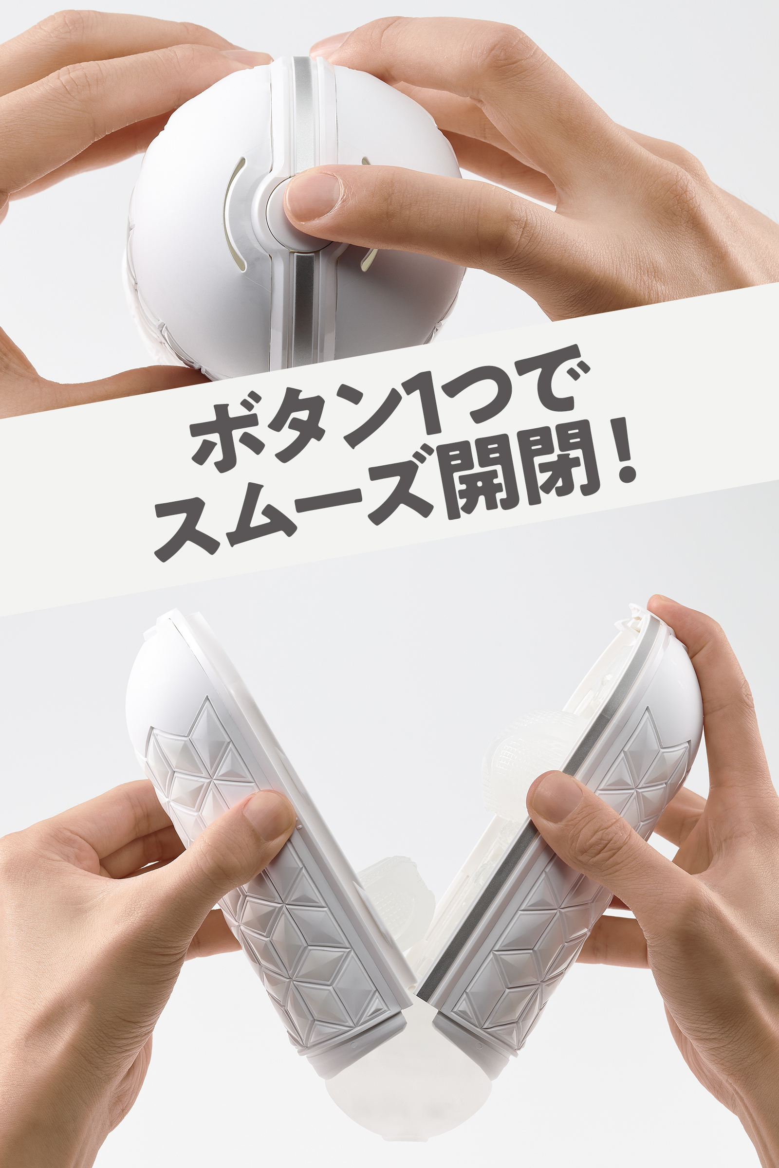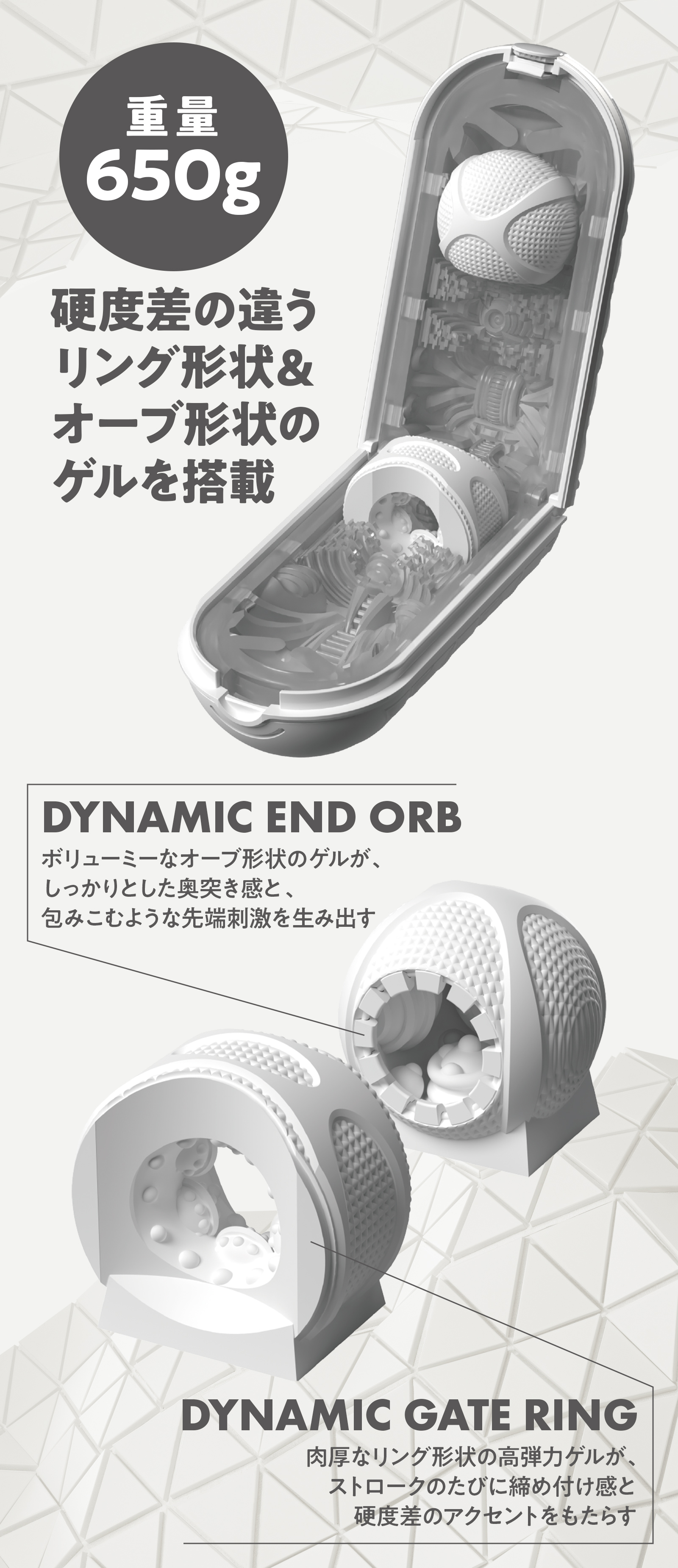 ストロークするたびにリングが締めつけ感を、オーブが奥突き感と包み込むような先端刺激を与え、新たな刺激を楽しめます。