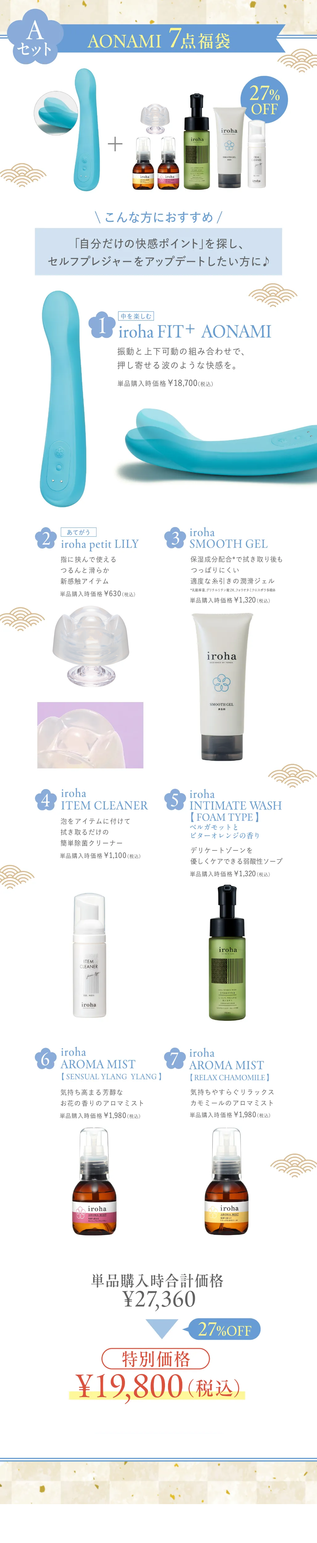 iroha FIT+ AONAMI(SMF-01)X1/ iroha petit LILY(FMP-03)×1/ iroha ITEM CLEANER(ICL-01)×1/ iroha SMOOTH GEL(IMG-02)×1/ iroha AROMA MIST【 RELAX CHAMOMILE 】(IAM-01)×1/ iroha AROMA MIST【 SENSUAL YLANG YLANG 】(IAM-02)X1/ iroha INTIMATE WASH 【 FOAM TYPE 】ベルガモットとビターオレンジの香り(IIF-01)X1 |